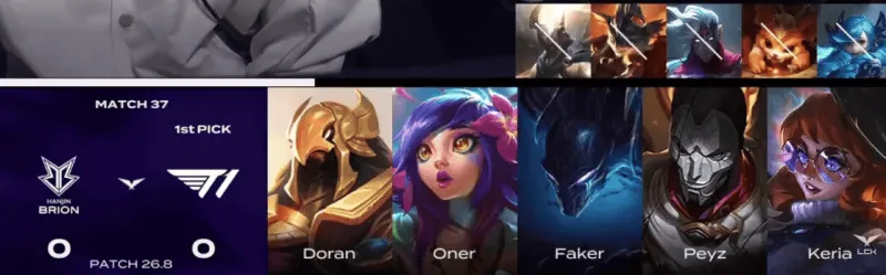 T1选用:Doran阿萝拉、Oner梦魇、Faker沙皇、Peyz烬、Keria妮蔻
