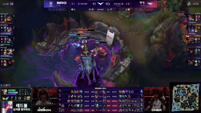 比赛第47分钟,T1再次拿下远古龙。随后BRO基地打出1换3但T1一波结束比赛。